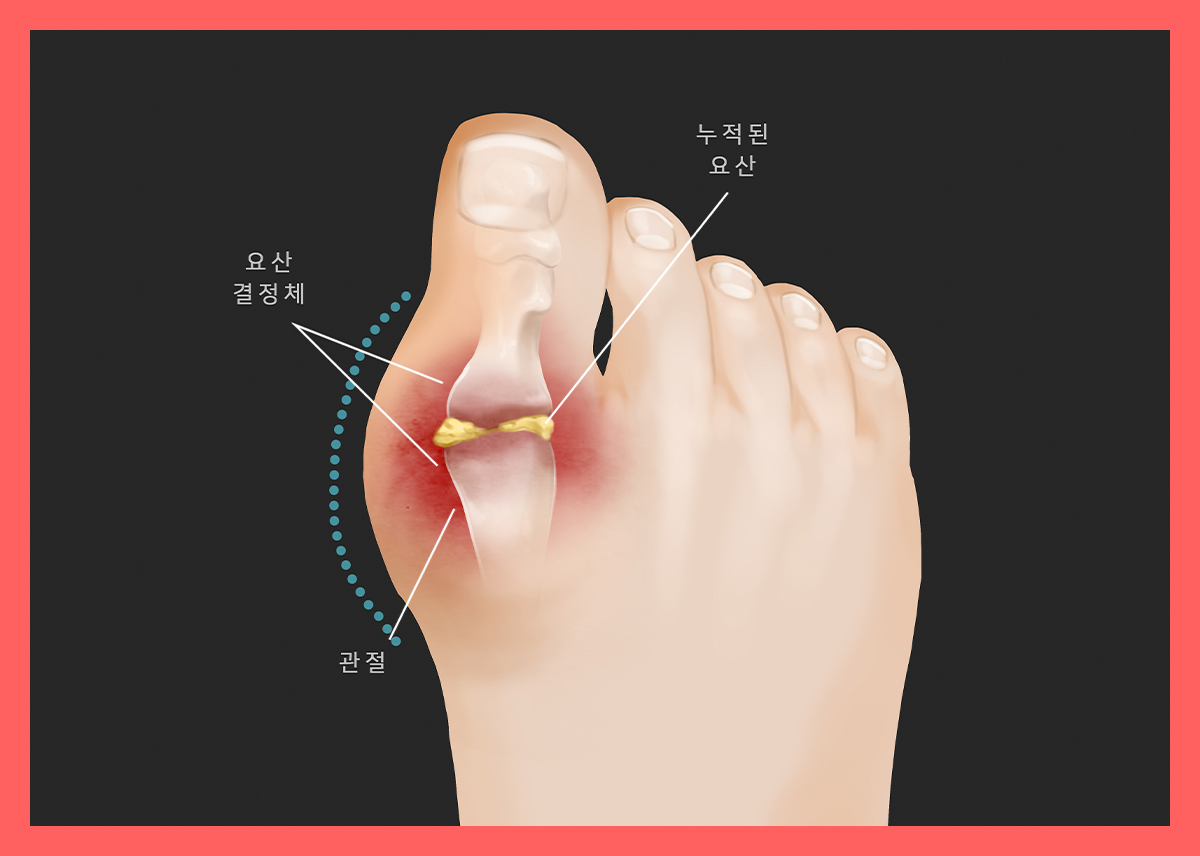 통풍은 혈중 내 요산 수치가 높아지면서 생긴 요산염 결정이 관절에 쌓여 통증을 유발하는 염증성 질환입니다.